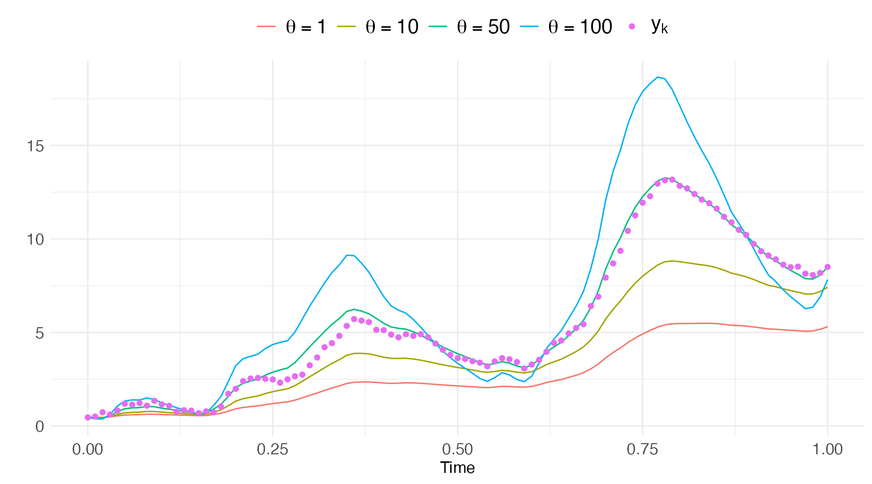 labels=unname(TeX(c("$\\theta=1$","$\\theta=10$","$\\theta=50","$\\theta=100$","$y_{k}$"))),